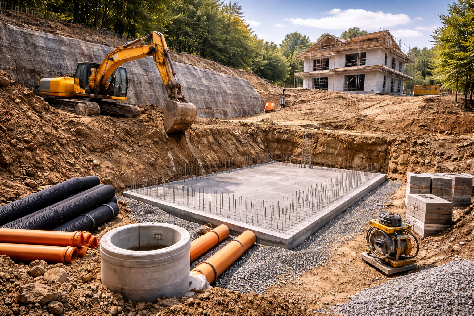 Der Tiefbau bildet die Grundlage für Standsicherheit, Entwässerung und Erschließung eines Bauprojekts.
